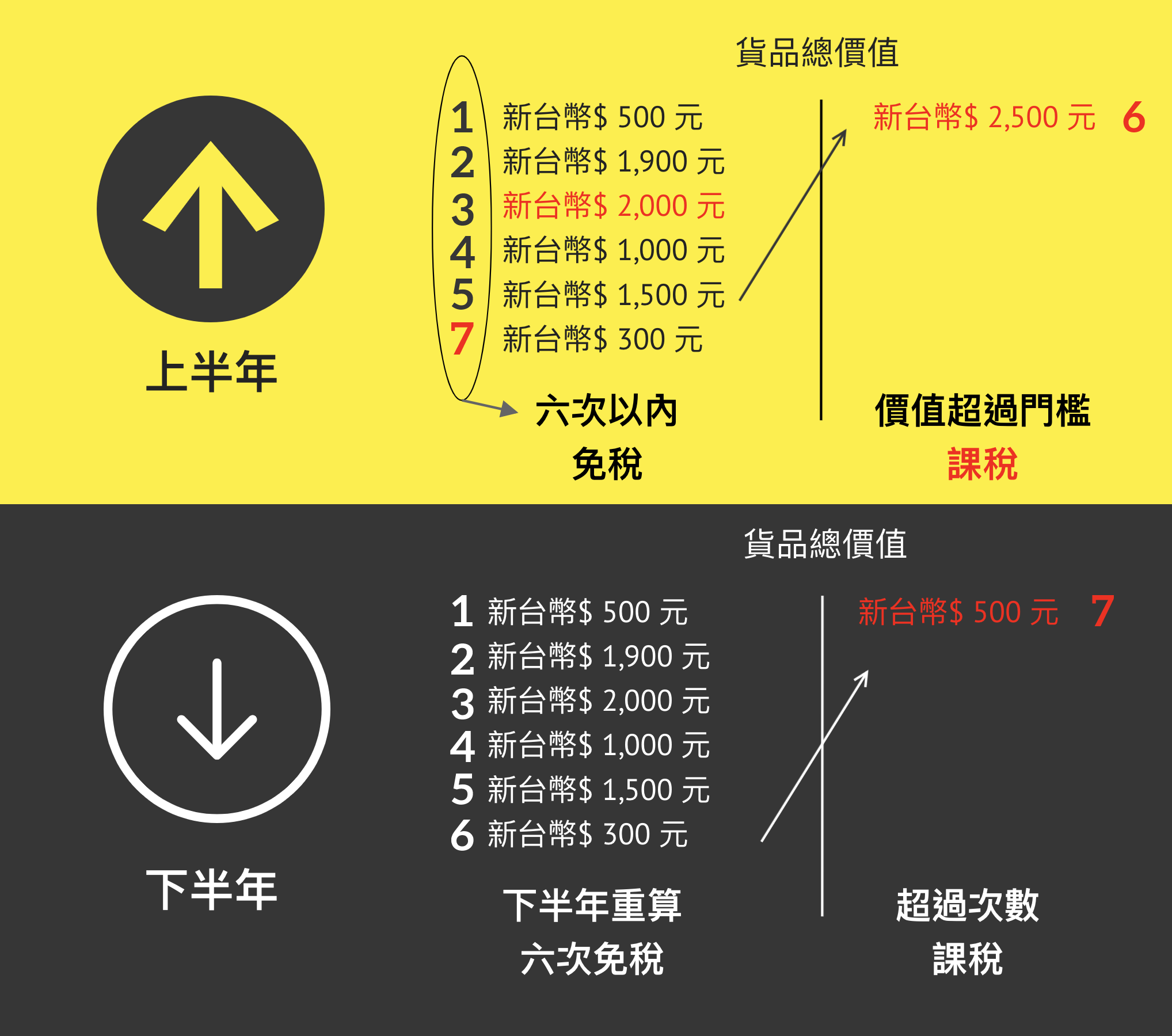 進口頻繁次數為每半年六次以內,到了第七次開始,不論進口貨品金額多少都一樣要課稅。