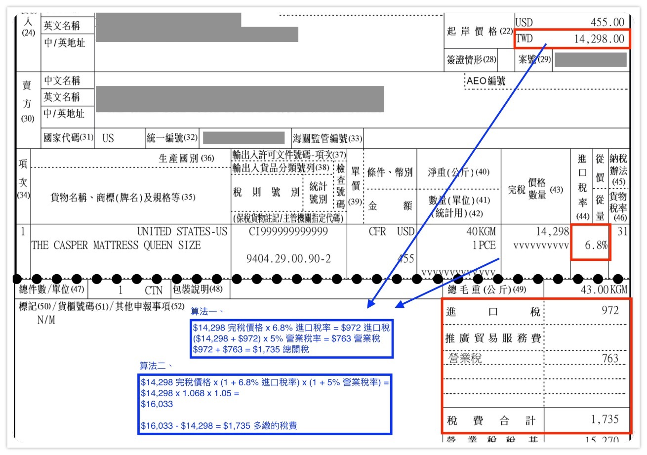 以下我們用真實進口報單上面的數字,透過公式來還原台灣進口關稅實際上到底是怎麼計算出來的: