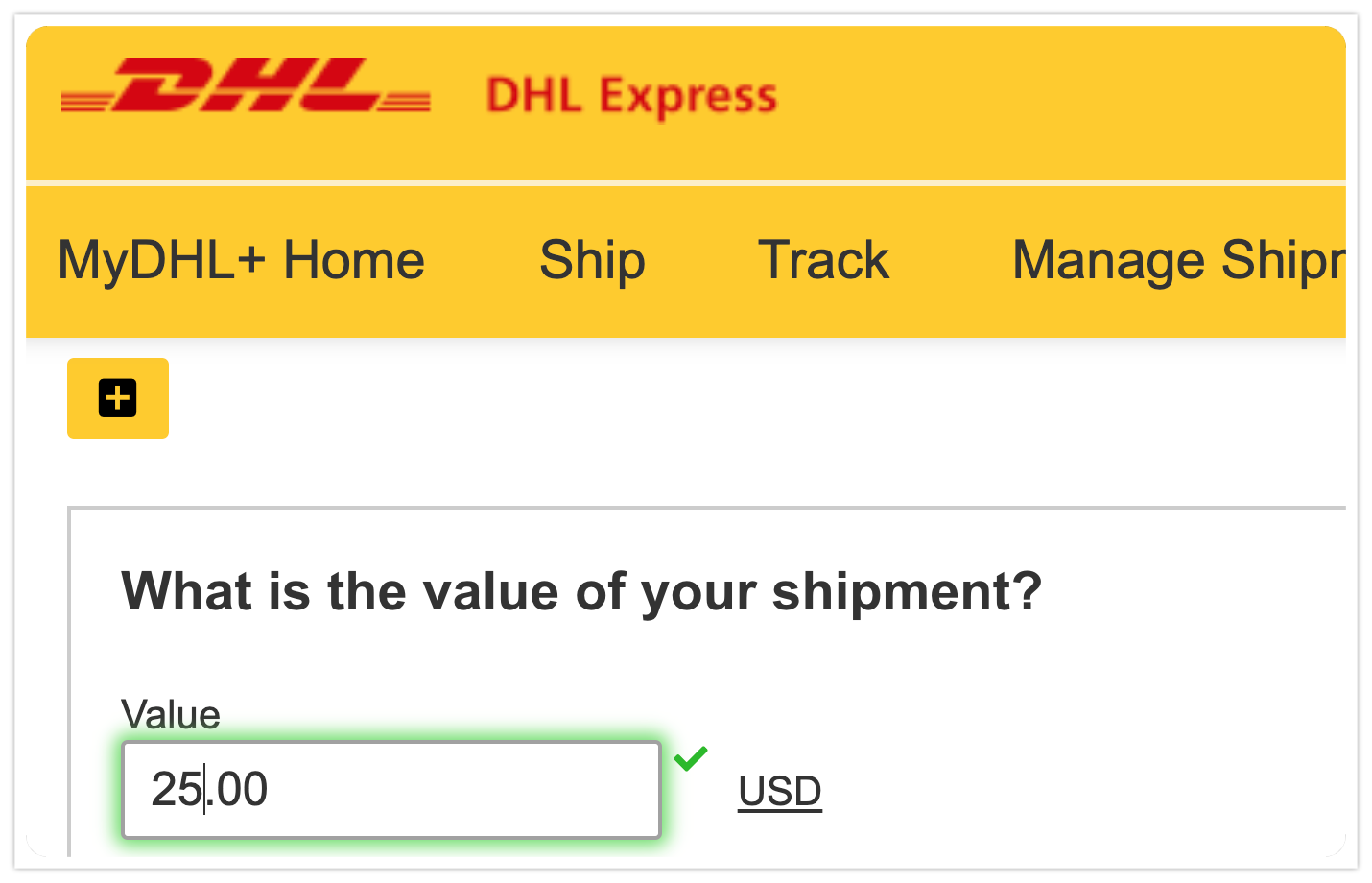 DHL 貨件製單頁面,填寫申報貨價值的欄位
