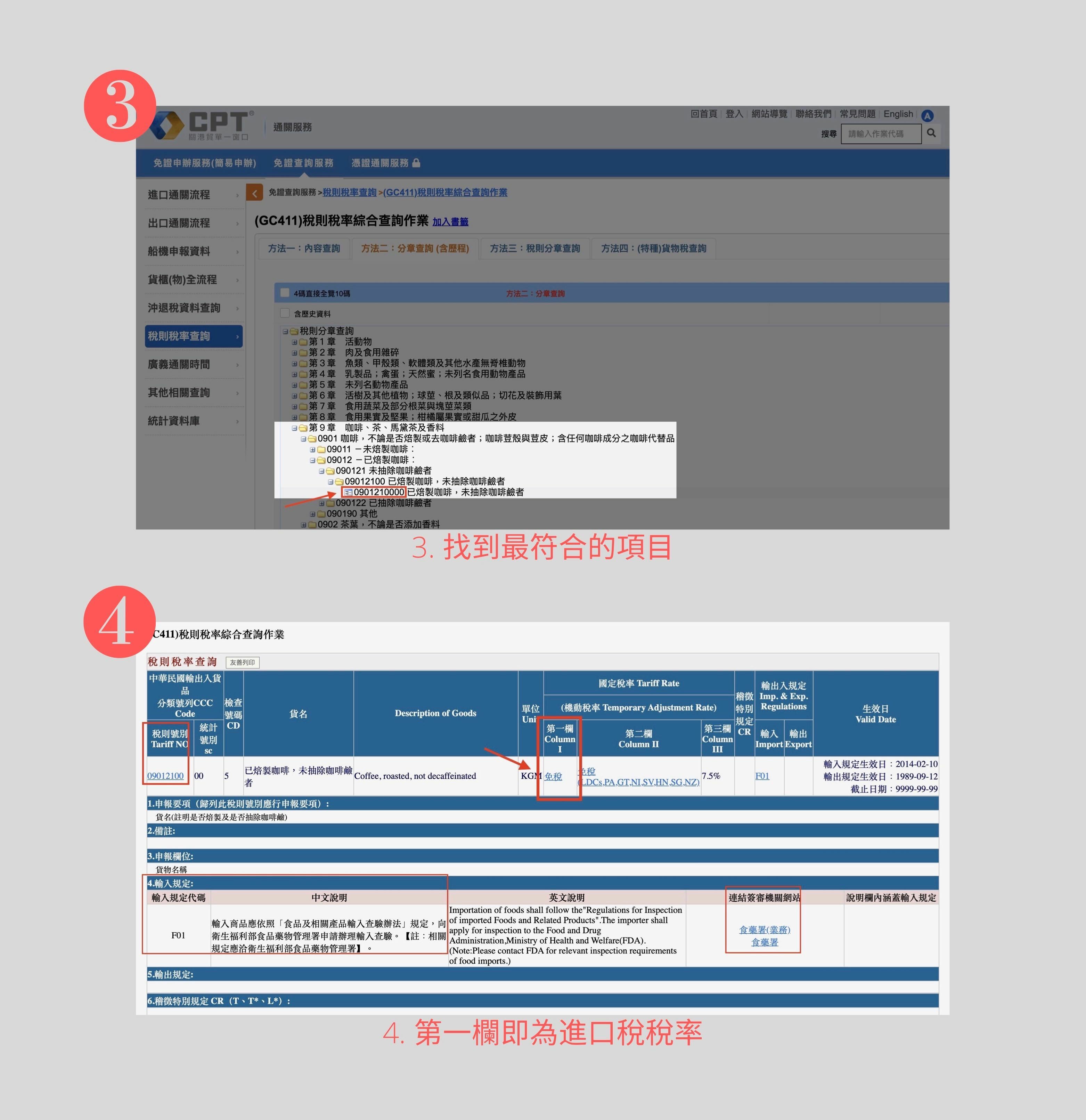 其中「稅則號別 (09012100)」就是這個商品類別的固定編號(稅則號碼),而固定稅率當中的「第一欄」就是該品項的「進口稅率」了(標示免稅代表這個類別沒有進口稅)。